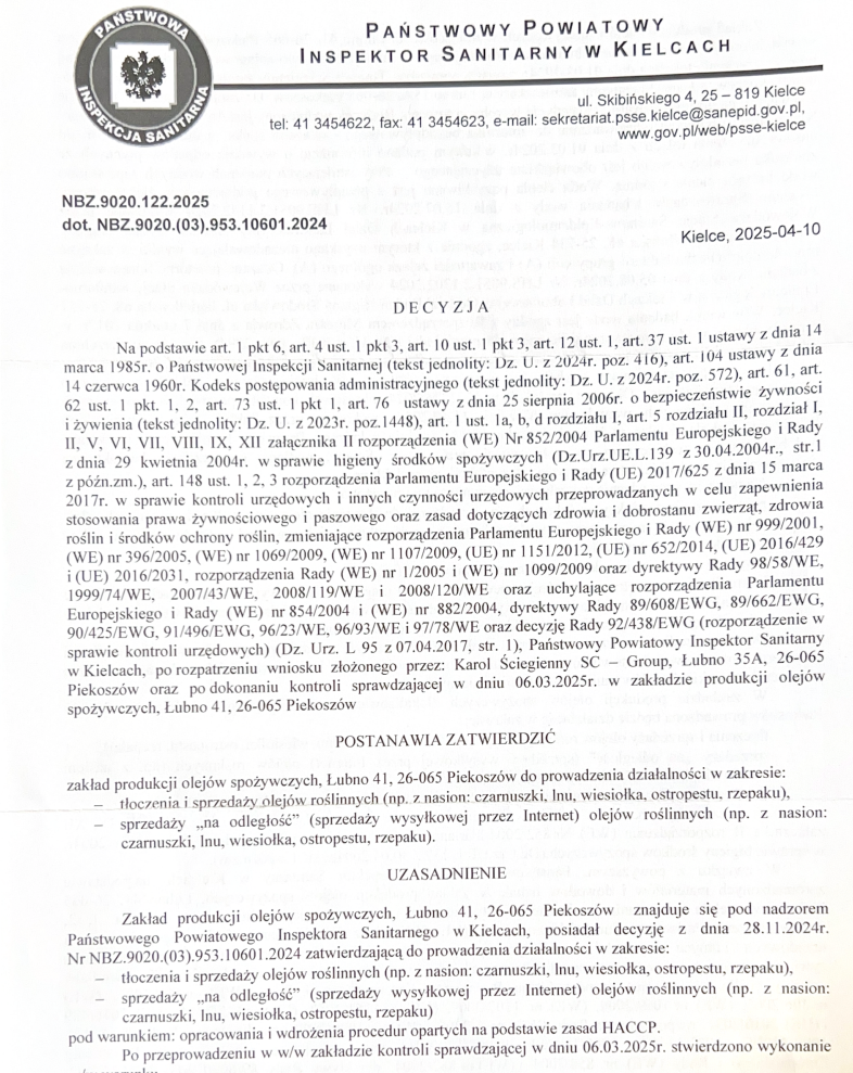 Dzięki temu masz pewność, że kupujesz olej nie tylko naturalny i świeży, ale również produkowany zgodnie z prawem i pod nadzorem odpowiednich instytucji.