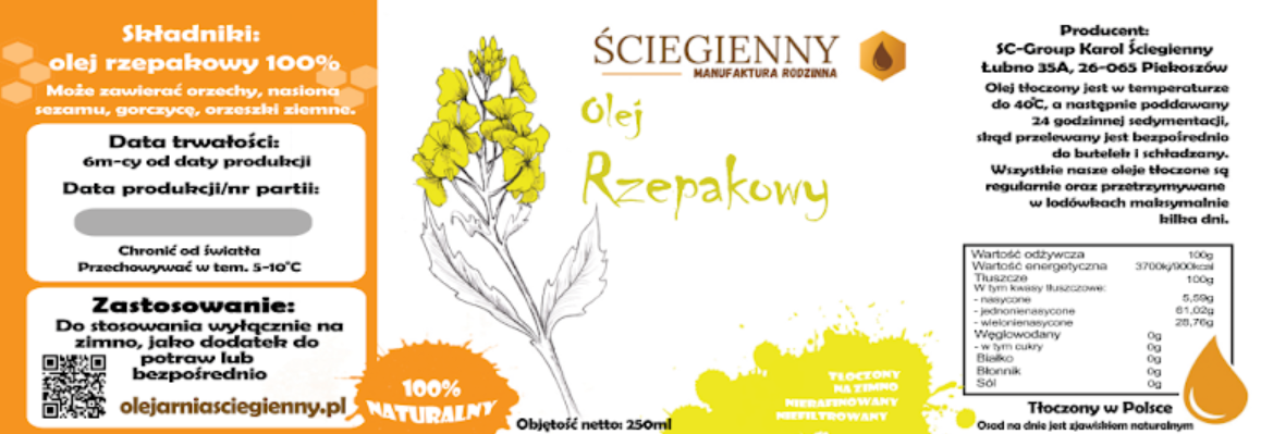 - Tłoczony na zimno - 100 % naturalny olej rzepakowy